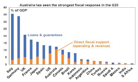 - Australia has seen the strongest fiscal response in the G20. Loans and guarantees are helpful but they leave businesses more indebted, whereas actual fiscal stimulus provides a direct boost. So actual fiscal support is a better measure and on this front Australia at 10.6% of GDP has provided by far the strongest fiscal stimulus of G20 countries.